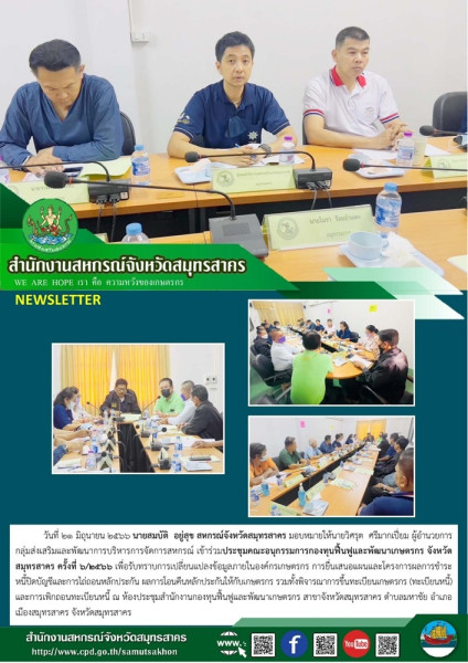 เมื่อวันที่ 21 มิถุนายน 2566 นายสมบัติ อยู่สุข สหกรณ์จังหวัดสมุทรสาคร มอบหมายให้นายวิศรุต ศรีมากเปี่ยม ผู้อำนวยการกลุ่มส่งเสริมและพัฒนาการบริหารการจัดการสหกรณ์ เข้าร่วมประชุมคณะอนุกรรมการกองทุนฟื้นฟูและพัฒนาเกษตรกร จังหวัดสมุทรสาคร ครั้งที่ 6/2566 เพื่อรับทราบการเปลี่ยนแปลงข้อมูลภายในองค์กรเกษตรกร การยื่นเสนอแผนและโครงการ ผลการชำระหนี้ปิดบัญชีและการไถ่ถอนหลักประกัน ผลการโอนคืนหลักประกันให้กับเกษตรกร รวมทั้งพิจารณาการขึ้นทะเบียนเกษตรกร (ทะเบียนหนี้) และการเพิกถอนทะเบียนหนี้ ณ ห้องประชุมสำนักงานกองทุนฟื้นฟูและพัฒนาเกษตรกร สาขาจังหวัดสมุทรสาคร ตำบลมหาชัย อำเภอเมืองสมุทรสาคร จังหวัดสมุทรสาคร