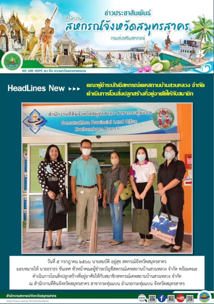 เมื่อวันที่ 5 กรกฎาคม 2566 นายสมบัติ อยู่สุข สหกรณ์จังหวัดสมุทรสาคร มอบหมายให้ นายธราธร ขันเทศ หัวหน้าคณะผู้ชำระบัญชีสหกรณ์เคหสถานบ้านสวนหลวง จำกัด พร้อมคณะ ดำเนินการโอนสิ่งปลูกสร้างที่อยู่อาศัยให้กับสมาชิกสหกรณ์เคหสถานบ้านสวนหลวง จำกัด ณ สำนักงานที่ดินจังหวัดสมุทรสาคร สาขากระทุ่มแบน อำเภอกระทุ่มแบน จังหวัดสมุทรสาคร