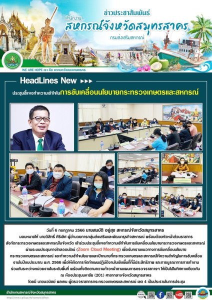 เมื่อวันที่ 6 กรกฎาคม 2566 นายสมบัติ อยู่สุข สหกรณ์จังหวัดสมุทรสาคร มอบหมายให้ นายวิสิทธิ์ ศิริเลิศ ผู้อำนวยการกลุ่มส่งเสริมและพัฒนาธุรกิจสหกรณ์ พร้อมด้วยหัวหน้าส่วนราชการ สังกัดกระทรวงเกษตรและสหกรณ์ในจังหวัด เข้าร่วมประชุมชี้แจงทำความเข้าใจในการขับเคลื่อนนโยบายกระทรวงเกษตรและสหกรณ์ ผ่านระบบประชุมทางไกลออนไลน์ (Zoom Cloud Meeting) เพื่อรับทราบแนวทางการขับเคลื่อนนโยบาย กระทรวงเกษตรและสหกรณ์ และทำความเข้าใจนโยบายและเป้าหมายที่กระทรวงเกษตรและสหกรณ์ให้ความสำคัญในการขับเคลื่อนงานในปีงบประมาณ พ.ศ. 2566 เพื่อให้เกิดการจัดทำแผนปฏิบัติงานในเชิงพื้นที่ที่มีประสิทธิภาพ และการบูรณาการการทำงาน ร่วมกันระหว่างหน่วยงานในระดับพื้นที่ พร้อมทั้งติดตามความก้าวหน้าตามแผนการตรวจราชการฯ ให้เป็นไปในทิศทางเดียวกัน ณ ห้องประชุมมหาชัย (201) ศาลากลางจังหวัดสมุทรสาคร โดยมี นายนวนิตย์ พลเคน ผู้ตรวจราชการกระทรวงเกษตรและสหกรณ์ เขต 4 เป็นประธานในการประชุม