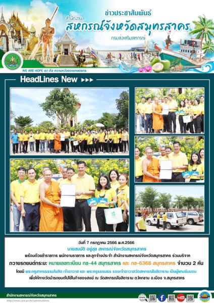 เมื่อวันที่ 7 กรกฎาคม 2566 พ.ศ.2566 นายสมบัติ อยู่สุข สหกรณ์จังหวัดสมุทรสาคร พร้อมด้วยข้าราชการ พนักงานราชการ และลูกจ้างประจำ สำนักงานสหกรณ์จังหวัดสมุทรสาคร ร่วมบริจาคถวายรถยนต์กระบะ หมายเลขทะเบียน กข-44 สมุทรสาคร และ กข-6368 สมุทรสาคร จำนวน 2 คัน โดยมี พระครูสาครธรรมโฆสิต เจ้าอาวาส และ พระครูธรรมธร รองเจ้าอาวาสวัดสหกรณ์โฆสิตาราม เป็นผู้แทนรับมอบ เพื่อให้ทางวัดนำรถยนต์ไปใช้ในกิจของสงฆ์ ณ วัดสหกรณ์โฆสิตาราม ต.โคกขาม อ.เมือง จ.สมุทรสาคร
