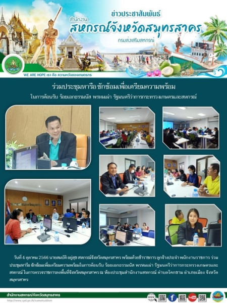 เมื่อวันที่ 4 ตุลาคม 2566 นายสมบัติ อยู่สุข สหกรณ์จังหวัดสมุทรสาคร พร้อมด้วยข้าราชการ ลูกจ้างประจำ พนักงานราชการ ร่วมประชุมหารือ ซักซ้อมเพื่อเตรียมความพร้อมในการต้อนรับ ร้อยเอกธรรมนัส พรหมเผ่า รัฐมนตรีว่าการกระทรวงเกษตรและสหกรณ์ ในการตรวจราชการลงพื้นที่จังหวัดสมุทรสาคร ณ ห้องประชุมสำนักงานสหกรณ์ ตำบลโคกขาม อำเภอเมือง จังหวัดสมุทรสาคร