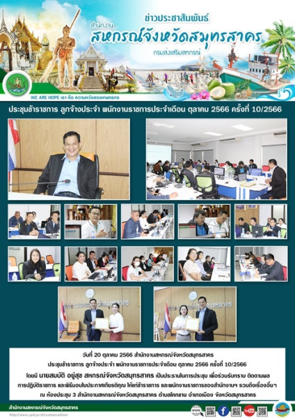 เมื่อวันที่ 20 ตุลาคม 2566 สำนักงานสหกรณ์จังหวัดสมุทรสาคร ประชุมข้าราชการ ลูกจ้างประจำ พนักงานราชการ ประจำเดือน ตุลาคม 2566 ครั้งที่ 10/2566 โดยมีนายสมบัติ อยู่สุข สหกรณ์จังหวัดสมุทรสาคร เป็นประธานในการประชุม เพื่อร่วมรับทราบ ติดตามผลการปฏิบัติราชการและพิธีมอบใบประกาศเกียรติคุณ ให้แก่ข้าราชการ และพนักงานราชการของสำนักงานฯ รวมถึงเรื่องอื่นๆ ณ ห้องประชุม 3 สำนักงานสหกรณ์จังหวัดสมุทรสาคร ตำบลโคกขาม อำเภอเมือง จังหวัดสมุทรสาคร