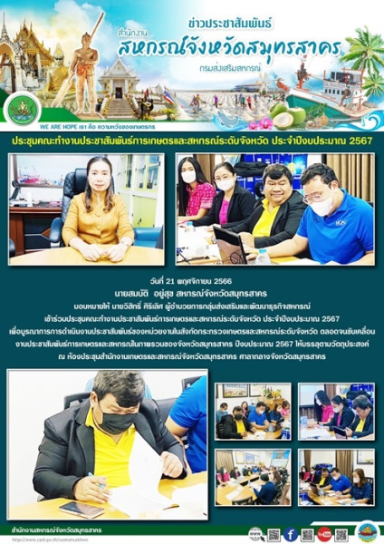 เมื่อวันที่ 21 พฤศจิกายน 2566 นายสมบัติ อยู่สุข สหกรณ์จังหวัดสมุทรสาคร มอบหมายให้ นายวิสิทธิ์ ศิริเลิศ ผู้อำนวยการกลุ่มส่งเสริมและพัฒนาธุรกิจสหกรณ์ เข้าร่วมประชุมคณะทำงานประชาสัมพันธ์การเกษตรและสหกรณ์ระดับจังหวัด ประจำปีงบประมาณ 2567 เพื่อบูรณาการการดำเนินงานประชาสัมพันธ์ของหน่วยงานในสังกัดกระทรวงเกษตรและสหกรณ์ระดับจังหวัด ตลอดจนขับเคลื่อนงานประชาสัมพันธ์การเกษตรและสหกรณ์ในภาพรวมของจังหวัดสมุทรสาคร ปีงบประมาณ 2567 ให้บรรลุตามวัตถุประสงค์ ณ ห้องประชุมสำนักงานเกษตรและสหกรณ์จังหวัดสมุทรสาคร ศาลากลางจังหวัดสมุทรสาคร
