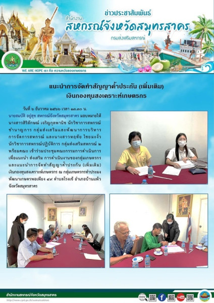 วันที่ 6 ธันวาคม 2566 เวลา 13.30 น. นายสมบัติ อยู่สุข สหกรณ์จังหวัดสมุทรสาคร มอบหมายให้นางสาวสิริลักษณ์ เจริญกุลพานิช นักวิชาการสหกรณ์ชำนาญการ กลุ่มส่งเสริมและพัฒนาการบริหารการจัดการสหกรณ์ และนางสาวหฤทัย ไชยมะงั่ว นักวิชาการสหกรณ์ปฏิบัติการ กลุ่มส่งเสริมสหกรณ์ 2 พร้อมคณะ เข้าร่วมประชุมคณะกรรมการดำเนินการ เพื่อแนะนำ ส่งเสริม การดำเนินงานของกลุ่มเกษตรกร และแนะนำการจัดทำสัญญาค้ำประกัน (เพิ่มเติม) เงินกองทุนสงเคราะห์เกษตรกร ณ กลุ่มเกษตรกรทำประมงพัฒนาเกษตรพอเพียง 49 ตำบลโรงเข้ อำเภอบ้านแพ้ว จังหวัดสมุทรสาคร