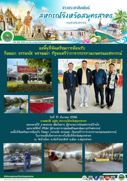 วันที่ 15 ธันวาคม 2566 นายสมบัติ อยู่สุข สหกรณ์จังหวัดสมุทรสาคร มอบหมายให้ นายพรเทพ เสียงไพเราะ ผู้อำนวยการนิคมสหกรณ์บ้านไร และนายวิสิทธิ์ ศิริเลิศ ผู้อำนวยการกลุ่มส่งเสริมและพัฒนาธุรกิจสหกรณ์ ลงพื้นที่จัดเตรียมการต้อนรับ ร้อยเอก ธรรมนัส พรหมเผ่า รัฐมนตรีว่าการกระทรวงเกษตรและสหกรณ์ ในการลงพื้นที่ตรวจราชการในพื้นที่จังหวัดสมุทรสาคร ณ วัดบ้านโคก ต.พันท้ายนรสิงห์ อ.เมือง จ.สมุทรสาคร