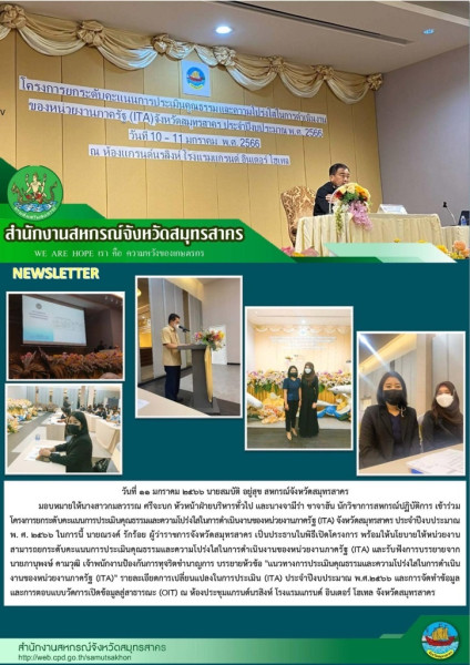เมื่อวันที่ 11 มกราคม 2566 นายสมบัติ อยู่สุข สหกรณ์จังหวัดสมุทรสาคร มอบหมายให้นางสาวกมลวรรณ ศรีจะบก หัวหน้าฝ่ายบริหารทั่วไป และนางจามีร่า ชาจาฮัน นักวิชาการสหกรณ์ปฏิบัติการ เข้าร่วมโครงการยกระดับคะแนนการประเมินคุณธรรมและความโปร่งใสในการดำเนินงานของหน่วยงานภาครัฐ (ITA) จังหวัดสมุทรสาคร ประจําปีงบประมาณพ. ศ. 2566 ในการนี้ นายณรงค์ รักร้อย ผู้ว่าราชการจังหวัดสมุทรสาคร เป็นประธานในพิธีเปิดโครงการ พร้อมให้นโยบายให้หน่วยงานสามารถยกระดับคะแนนการประเมินคุณธรรมและความโปร่งใสในการดำเนินงานของหน่วยงานภาครัฐ (ITA) และรับฟังการบรรยายจาก นายภานุพงษ์ คามวุฒิ เจ้าพนักงานป้องกันการทุจริตชำนาญการ บรรยายห้วข้อ "แนวทางการประเมินคุณธรรมและความโปร่งใสในการดำเนินงานของหน่วยงานภาครัฐ (ITA)" รายละเอียดการเปลี่ยนแปลงในการประเมิน (ITA) ประจําปีงบประมาณ พ.ศ.2566 และการจัดทำข้อมูลและการตอบแบบวัดการเปิดข้อมูลสู่สาธารณะ (OIT) ณ ห้องประชุมแกรนด์นรสิงห์ โรงแรมแกรนด์ อินเตอร์ โฮเทล จังหวัดสมุทรสาคร