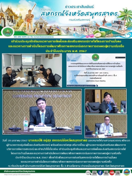 เมื่อวันที่ 18 มกราคม 2567 นายสมบัติ อยู่สุข สหกรณ์จังหวัดสมุทรสาคร มอบหมายให้นางสาวกมลวรรณ ศรีจะบกผู้อำนวยการกลุ่มจัดตั้งและส่งเสริมสหกรณ์ พร้อมด้วยนายวิศรุต ศรีมากเปี่ยม ผู้อำนวยการกลุ่มส่งเสริมและพัฒนาการบริหารการจัดการสหกรณ์ และเจ้าหน้าที่ที่เกี่ยวข้อง เข้าร่วมประชุมซักซ้อมแนวทางการจัดตั้งและส่งเสริมสหกรณ์ภายใต้โครงการบ้านมั่นคงและแนวทางการดำเนินโครงการพัฒนาศักยภาพสหกรณ์นอกภาคการเกษตรสู่ความเข้มแข็ง ประจำปีงบประมาณ พ.ศ. 2567 เพื่อเข้ารับฟังแนวทางการส่งเสริมสหกรณ์ภายใต้โครงการบ้านมั่นคง และแนวทางการดำเนินโครงการพัฒนาศักยภาพสหกรณ์นอกภาคการเกษตรสู่ความเข้มแข็ง ณ ห้องประชุมสำนักงานสหกรณ์จังหวัดสมุทรสาคร ชั้น 3 ตำบลโคกขาม อำเภอเมืองสมุทรสาคร จังหวัดสมุทรสาคร