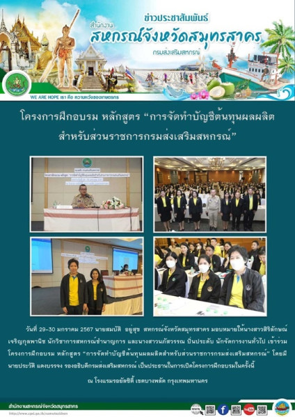เมื่อวันที่ 29-30 มกราคม 2567 นายสมบัติ อยู่สุข สหกรณ์จังหวัดสมุทรสาคร มอบหมายให้นางสาวสิริลักษณ์ เจริญกุลพานิช นักวิชาการสหกรณ์ชำนาญการ และนางสาวนภัสวรรณ ปิ่นประดับ นักจัดการงานทั่วไป เข้าร่วมโครงการฝึกอบรม หลักสูตร “การจัดทำบัญชีต้นทุนผลผลิตสำหรับส่วนราชการกรมส่งเสริมสหกรณ์” โดยมีนายประวัติ แดงบรรจง รองอธิบดีกรมส่งเสริมสหกรณ์ เป็นประธานในการเปิดโครงการฝึกอบรมในครั้งนี้ ณ โรงแรมรอยัลซิตี้ เขตบางพลัด กรุงเทพมหานคร