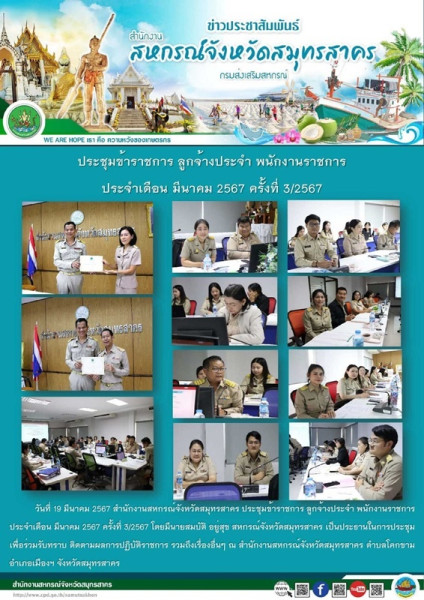 เมื่อวันที่ 19 มีนาคม 2567 สำนักงานสหกรณ์จังหวัดสมุทรสาคร ประชุมข้าราชการ ลูกจ้างประจำ พนักงานราชการ ประจำเดือน มีนาคม 2567 ครั้งที่ 3/2567 โดยมีนายสมบัติ อยู่สุข สหกรณ์จังหวัดสมุทรสาคร เป็นประธานในการประชุม เพื่อร่วมรับทราบ ติดตามผลการปฏิบัติราชการ รวมถึงเรื่องอื่นๆ ณ สำนักงานสหกรณ์จังหวัดสมุทรสาคร ตำบลโคกขาม อำเภอเมืองฯ จังหวัดสมุทรสาคร