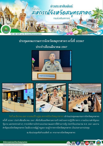 เมื่อวันที่ 26 มีนาคม 2567 นายสมบัติ อยู่สุข สหกรณ์จังหวัดสมุทรสาคร เข้าร่วมประชุมคณะกรมการจังหวัดสมุทรสาคร ครั้งที่ 3/2567 ประจำเดือนมีนาคม 2567 เพื่อรับฟังและติดตามความก้าวหน้าผลการปฏิบัติราชการ งานนโยบายสำคัญของรัฐบาล และกระทรวงต่างๆ การเร่งรัดการเบิกจ่ายงบประมาณและการใช้จ่ายภาครัฐ ประจำปีงบประมาณ พ.ศ. 2567 และงานสำคัญของจังหวัดสมุทรสาคร โดยมีนายวรณัฎฐ์ หนูรอต รองผู้ว่าราชการจังหวัดสมุทรสาคร เป็นประธานการประชุม