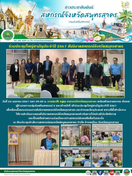 เมื่อวันที่ 24 เมษายน 2567 เวลา 09.00 น. นายสมบัติ อยู่สุข สหกรณ์จังหวัดสมุทรสาคร พร้อมด้วยนายธราธร ขันเทศ ผู้อำนวยการกลุ่มส่งเสริมสหกรณ์ 2 และเจ้าหน้าที่ เข้าร่วมประชุมใหญ่สามัญประจำปี 2567 เพื่อเลือกตั้งคณะกรรมการสันนิบาตสหกรณ์จังหวัดสมุทรสาคร และกำหนดวัตถุประสงค์ สถานที่ตั้งสำนักงาน ให้การดำเนินงานของสันนิบาตสหกรณ์จังหวัดสมุทรสาครดำเนินการไปอย่างมีประสิทธิภาพ